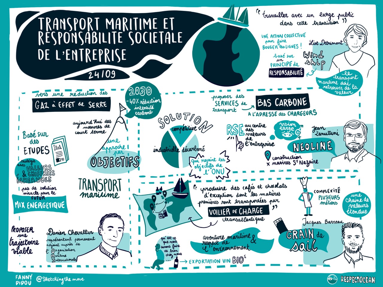 "Transport maritime et responsabilité sociétale de l’entreprise"Jeudi 24 septembre 2020, de 11h à 12h30Le 24 septembre 2020, RespectOcean a organisé un webinaire (en ligne) sur le thème «Transport maritime et responsabilité sociétale de l’entreprise : contexte, perspectives innovantes et raison d'être et de faire de deux acteurs engagés" Cet événement a été organisé en partenariat avec l'association Wind Ship, dans le cadre de la journée mondiale de la mer, dont le thème 2020 était "Des transports maritimes durables au service d'une planète durable" Dans ce webinaire ont été abordés dans un premier temps, la RSE et le contexte international de la transition énergétique du transport maritime. Deux entreprises, Neoline et Grain de Sail, ont ensuite exposé leurs démarches. Ces entreprises ont opté pour des modes de propulsion permettant de réduire leur impact environnemental et ce choix s'inscrit dans une politique de responsabilité sociétale d'entreprise plus large, qui a été exposée aux participants. Cliquez sur l'image pour l'agrandir Damien Chevalier, Représentant Permanent adjoint auprès de l'Organisation Maritime Internationale. Conseiller Maritime auprès de l'Ambassade de France au Royaume Uni. Technicien puis ingénieur en constructions navales, il passe la première partie sa carrière (1994-2005) dans les arsenaux militaires en chantier, bureau d'études, centre de recherche et direction de programme. Il travaille alors sur des projets de navires de surface et de sous-marins nationaux ou pour l'export. En 2005 il rejoint la sous-direction de la sécurité maritime à la Direction des Affaires Maritimes du ministère chargé des transports. Rapporteur pour la Commission Centrale de Sécurité, il est ensuite adjoint au chef de bureau en charge de la réglementation, puis chef du bureau de la réglementation et du contrôle de la sécurité des navires. Avant de rejoindre la représentation permanente au 1er septembre 2018, il était adjoint au sous-directeur de la sécurité maritime depuis 2016. Administrateur en chef des affaires maritimes, il est également conseiller maritime de l'ambassade de France au Royaume Uni. La Représentation de la France auprès de l'OMI est un poste diplomatique qui a pour mission principale de participer et d'exprimer la voix de la France à l'ensemble des travaux de l'Organisation Maritime Internationale, mais aussi au sein des Fonds internationaux d'indemnisation pour les dommages dus à la pollution par les hydrocarbures (FIPOL) et de l'Organisation internationale de télécommunications mobiles par satellites (IMSO). L'Organisation Maritime Internationale depuis les années 2000 travaille sur le sujet des émissions de gaz à effet de serre du secteur du transport maritime. Des études ont été réalisées et des négociations ont déjà été adoptés afin de limiter et réduire les émissions du transport maritime. L'adoption d'une stratégie en 2018 suite à l'Accord de Paris donne une nouvelle ambition à l'Organisation. Les négociations sont en cours pour relever le défi complexe de la décarbonation du transport maritime. En quelques années le régulateur doit garantir une transformation des technologies et du modèle du transport maritime basé depuis des décennies sur le fuel lourd. Lise Detrimont, pilote et coordinatrice de l'association Wind Ship Persuadée de la nécessité de développer un transport maritime de moindre impact, Lise Detrimont pilote et anime l'association Wind Ship : des entreprises s'unissent pour accélérer la transition écologique du transport maritime en structurant la filière de la propulsion des navires par le vent et en mobilisant la puissance publique et la société civile. Ingénieur diplômée d'AgroParisTech, elle a travaillé pendant 15 ans sur les enjeux environnementaux et sociaux des projets d'aménagement du territoire et de production agricoles et industrielles. Elle a réalisé dans ce cadre de nombreuses missions à l'international. Puis elle s'est engagée dans l'aide au développement en tant que directrice opérationnelle d'une association de solidarité internationale œuvrant en Guinée. Elle est titulaire depuis 2019 d'un Master 2 en droit maritime et droit de la mer, formation réalisée afin d'acquérir une compétence complémentaire et mieux appréhender les enjeux liés aux océans. Jean Zanuttini, Directeur Général, NEOLINE Après 7 ans comme Officier de Marine Marchande, notamment sur des rouliers et sur le Belem, Jean Zanuttini est devenu depuis 2010 consultant maritime et naval. Il conjugue une expertise technique, opérationnelle et commerciale. En 2011, avec Michel Pery, Jean Zanuttini démarre les travaux pour concevoir ce qui deviendra le Neoliner : un cargo roulier de 136m équipé de 4200m2 de voiles comme propulsion principale, respectueux de l'environnement, sûr et adapté à la pratique du commerce maritime. Depuis 2016, Jean se consacre à temps plein à la Direction du projet NEOLINE. NEOLINE est une start up à vocation industrielle créée en 2015 par des fondateurs principalement issus de la Marine Marchande. Elle porte un projet d'armateur, centré sur la transition écologique et la dépollution du transport maritime, de conception, construction et opération d'une flotte de cargos utilisant le vent comme source d'énergie principale. La société est aujourd'hui en fin de phase d'appel d'offre aux chantiers navals et devrait être en mesure de lancer la construction de son premier navire cette année. Jacques Barreau, Directeur Général, Grain de Sail Jacques BARREAU est associé fondateur et actionnaire de Grain de Sail, spécialiste du lancement et de l'organisation de grands projets (informatiques, électroniques, éolien offshore, énergies marines renouvelables). Formation et expérience : formation scientifique et Master en Innovation industrielle, un an d'études aux USA (Western Washington University). Dém